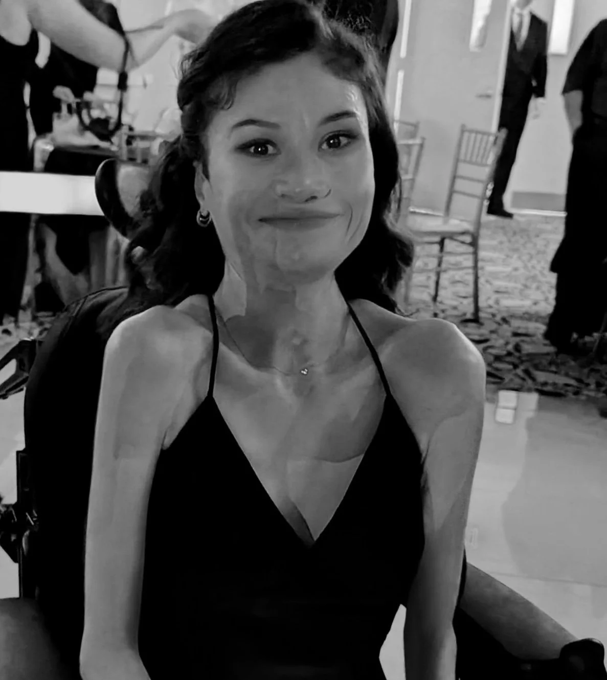 A black and white photo of Amanda, a disabled woman in her power wheelchair in a black dress.