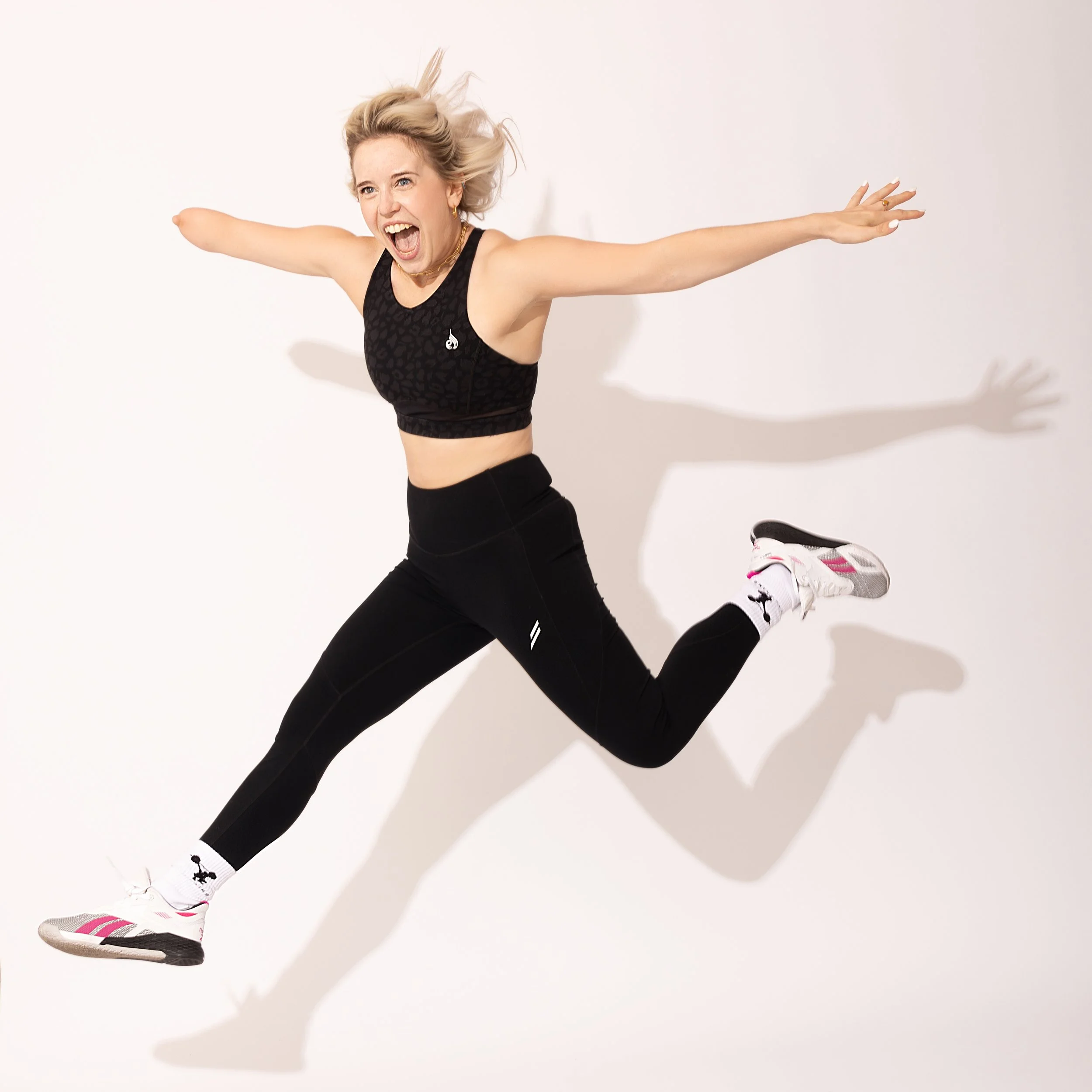 A white woman with long blonde hair poses and flexing her muscles wearing black sports wear. She has upper limb difference in her right arm and is stood straight on looking into the camera.