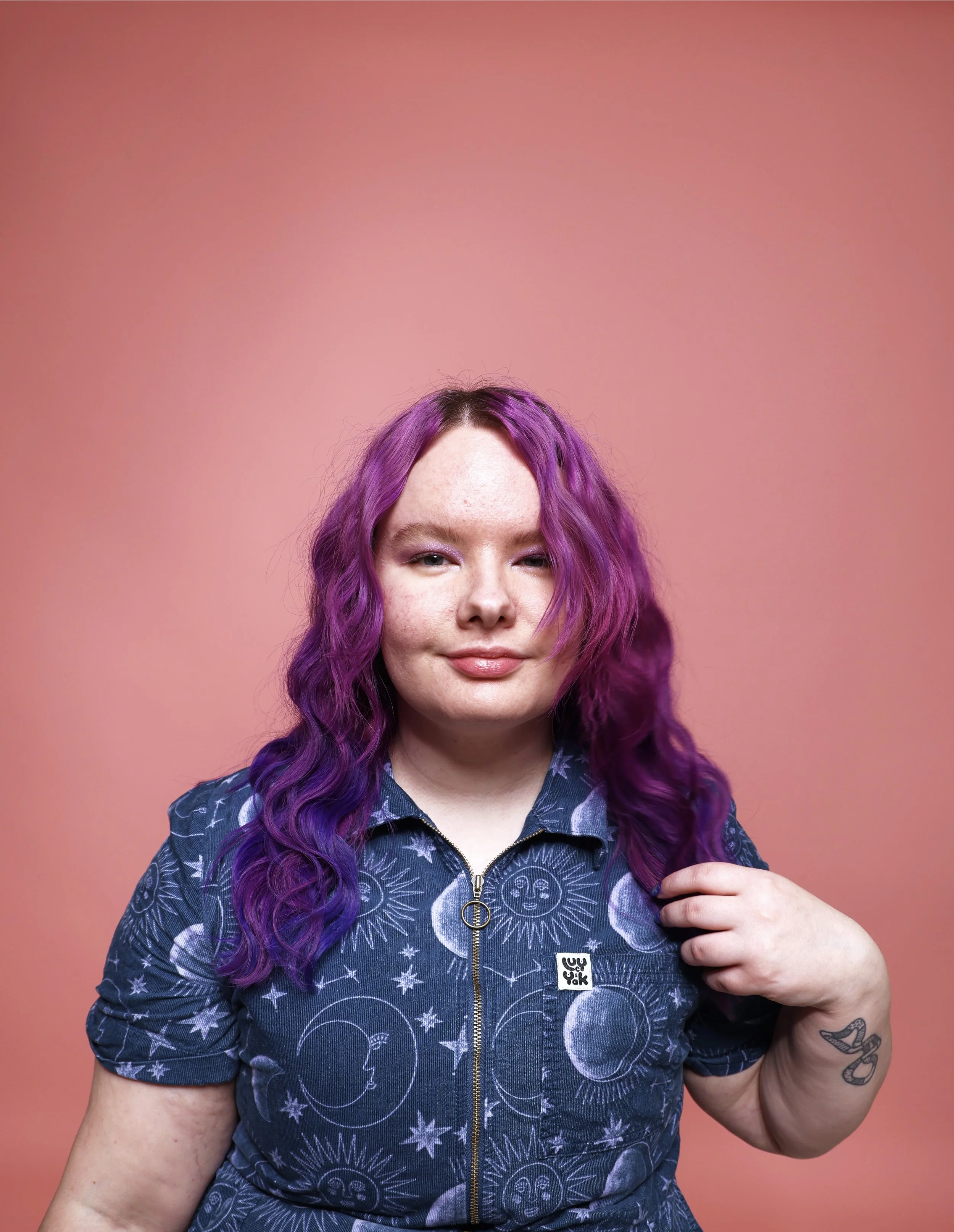 Charli is wearing an electric blue blazer and black t.shirt against a soft pink background. They have long wavy purple hair and they are holding a copy of their book ‘All Tangled Up in Autism and Chronic Illness’.
