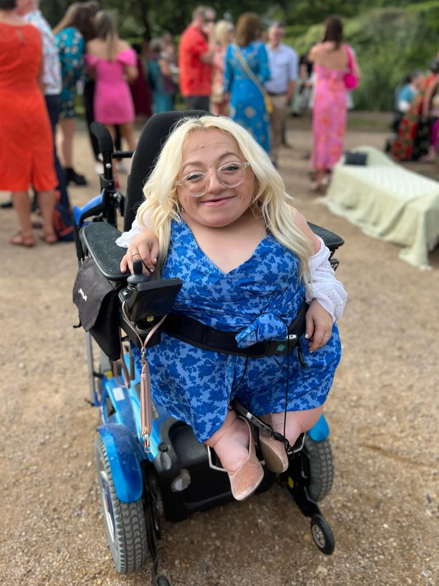 Gem is a small, white, blonde woman who is an electric wheelchair user. She's wearing a blue dress and blush pink heels at a gathering outside.
