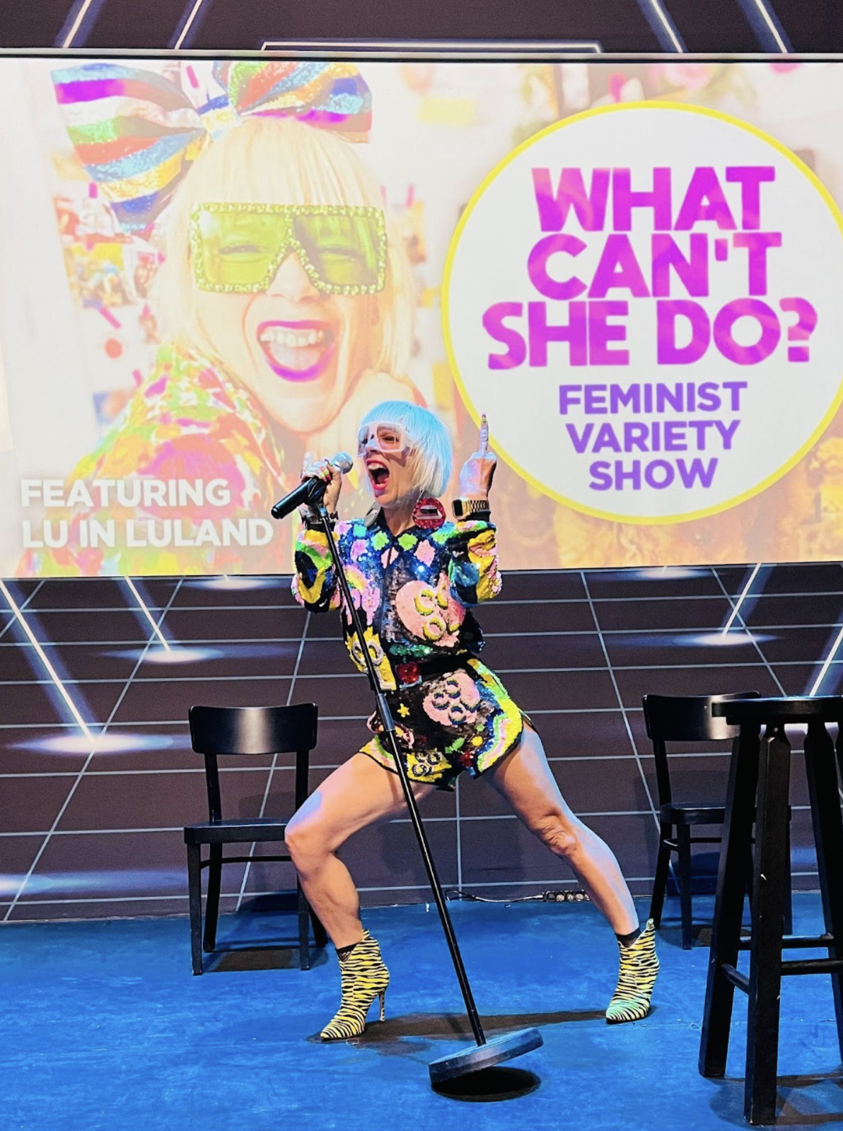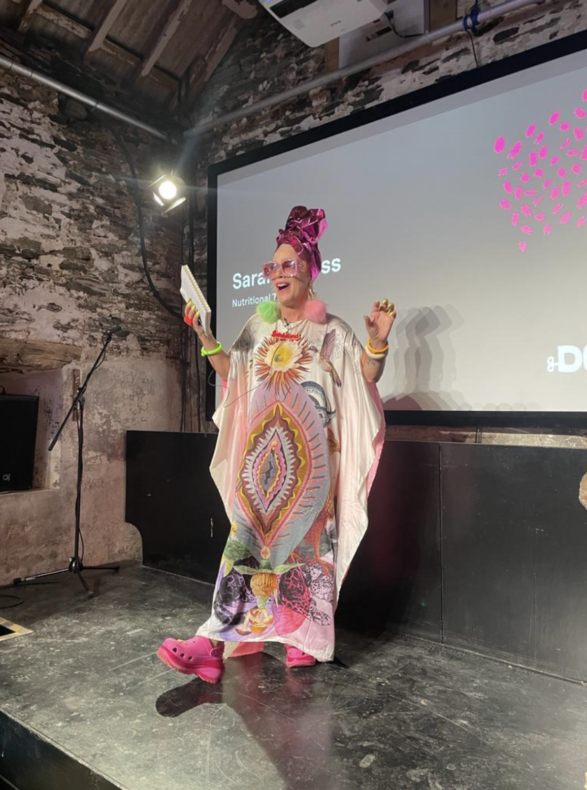 Lu is on stage at her TEDx talk in Portland. She's stood in front of the screen with her arms out wearing a long black dress with a thigh high slit up on side. She had tattoos on her leg and wears silver platform boots