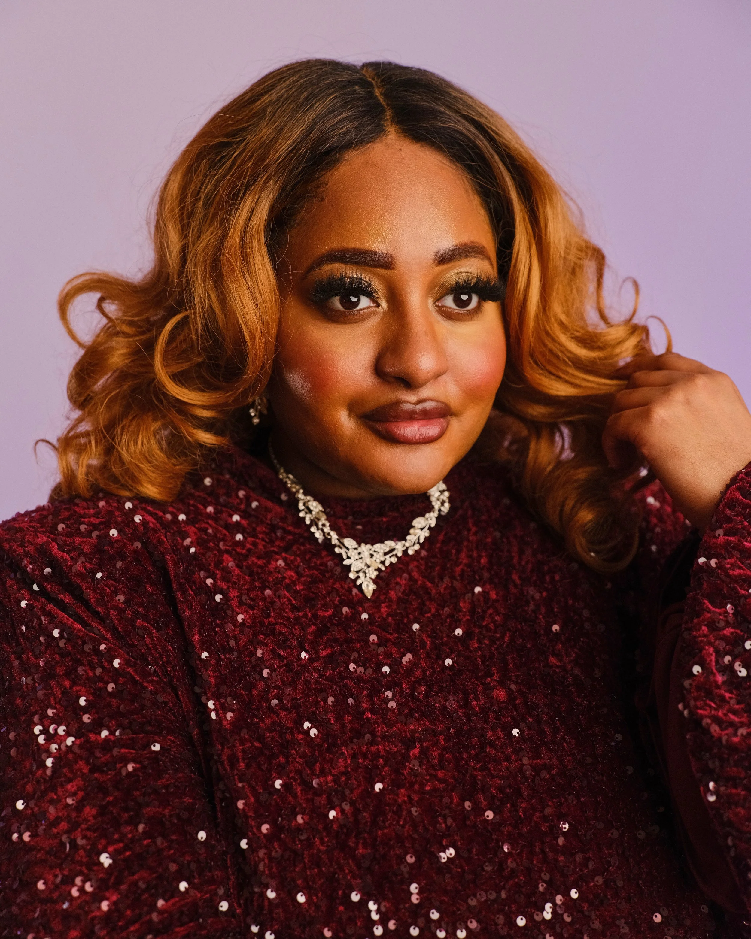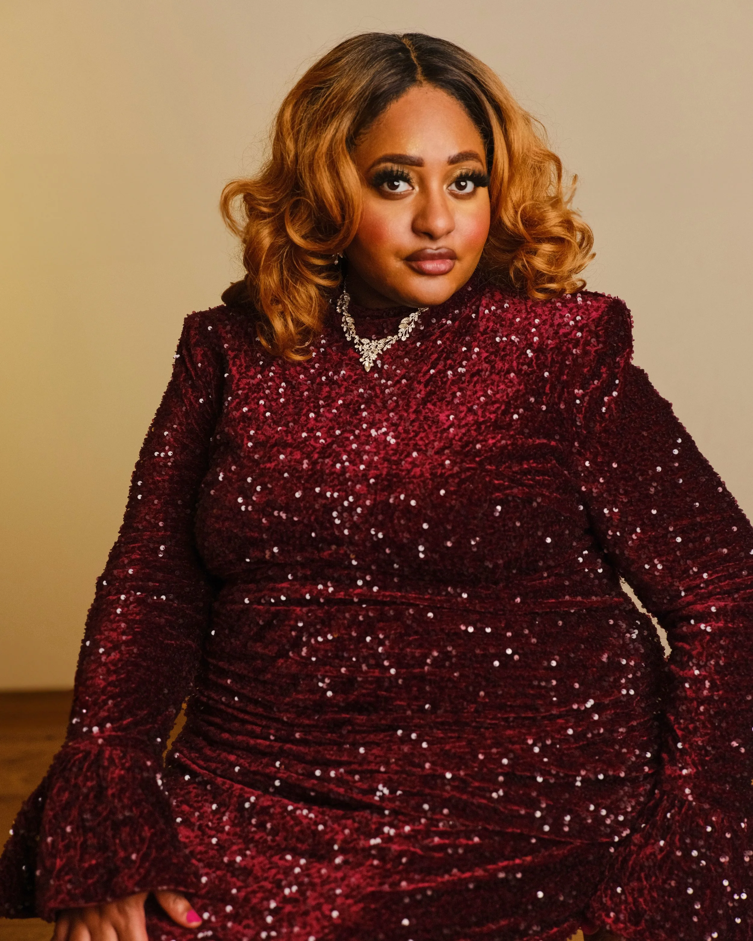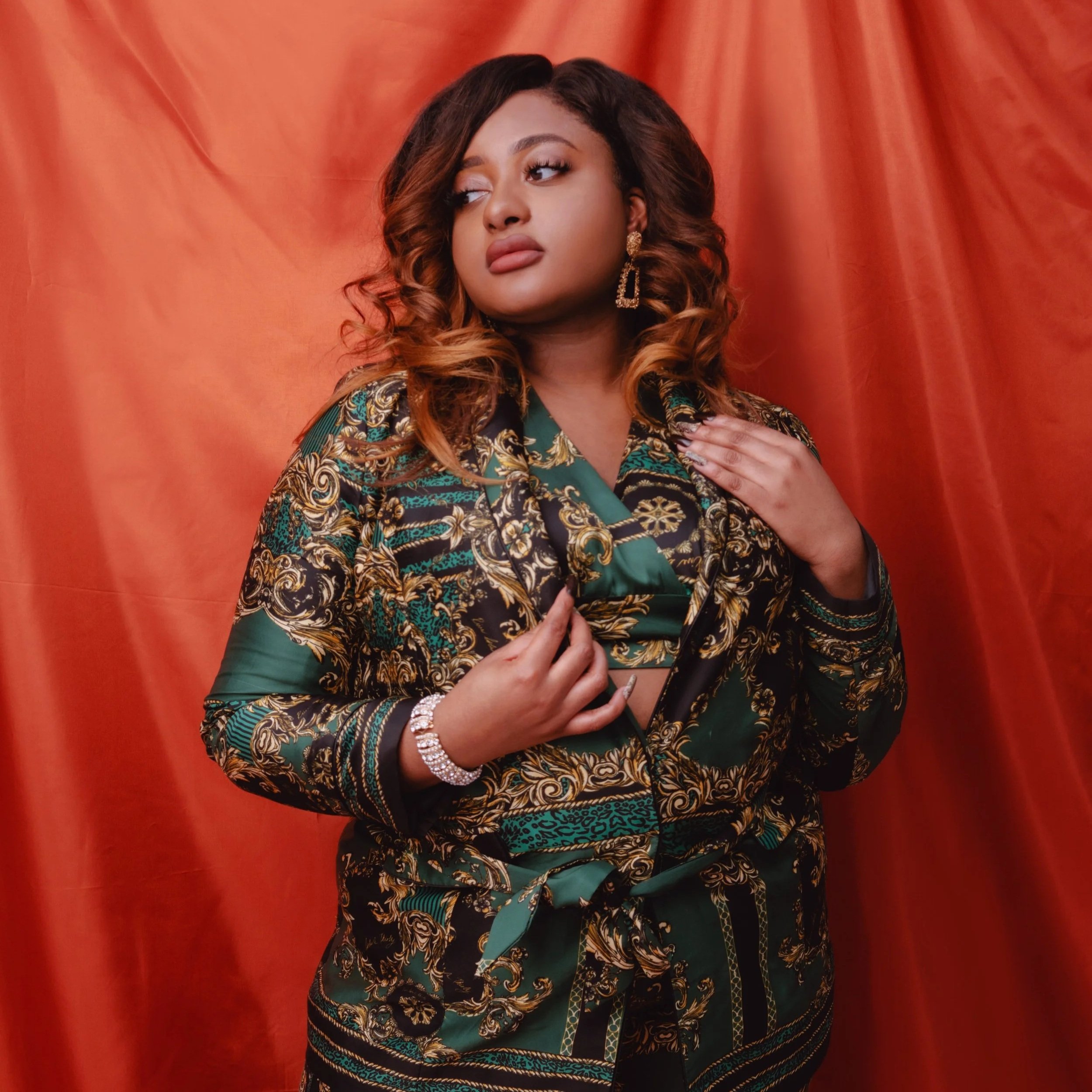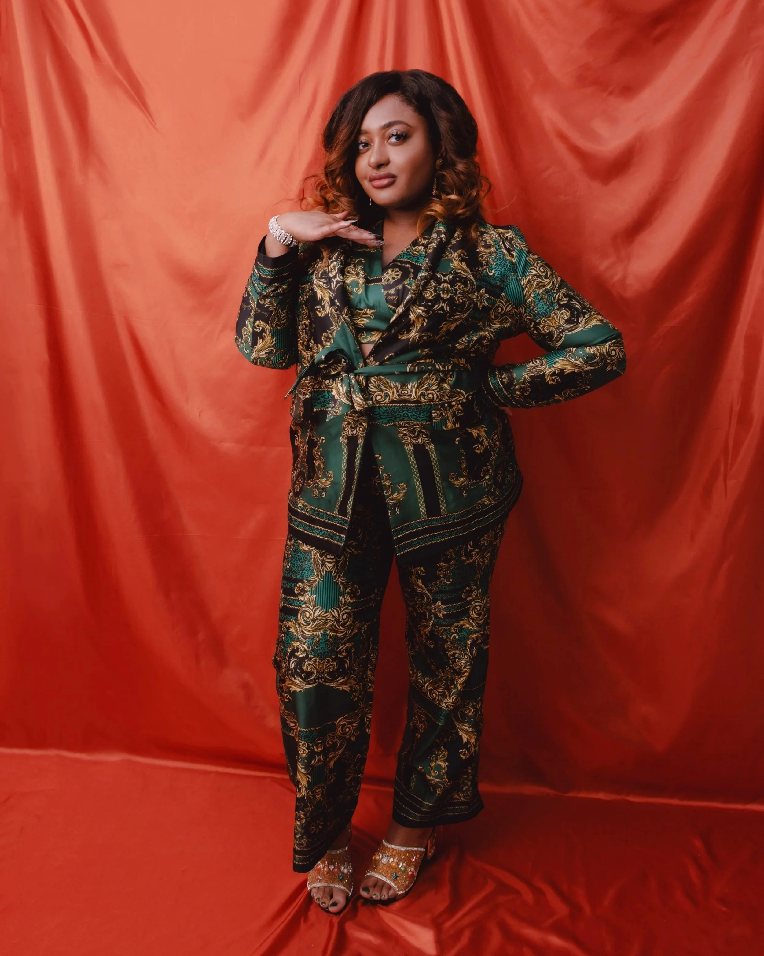 Michelle in front of a orange backdrop . She is dressed is a green, gold and black co-ord. She is wearing small gold heels . Her hair is styled in curls, transitioning from brown at the roots to blonde at the tips. She is wearing a silver bracelet. Her arm is raised near her face and her other arm is positioned on waist .