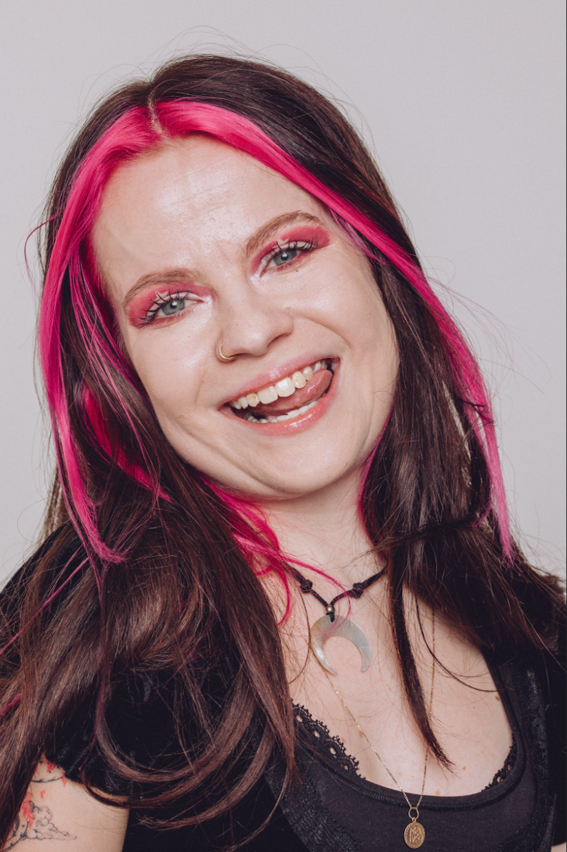 Molly is wearing a lilac sequin dress with cutouts and a hood. She is stood against a pink furry background with her walking stick. Her hair is red/brown and wavy and she has tattoos on her arms, legs and chest.