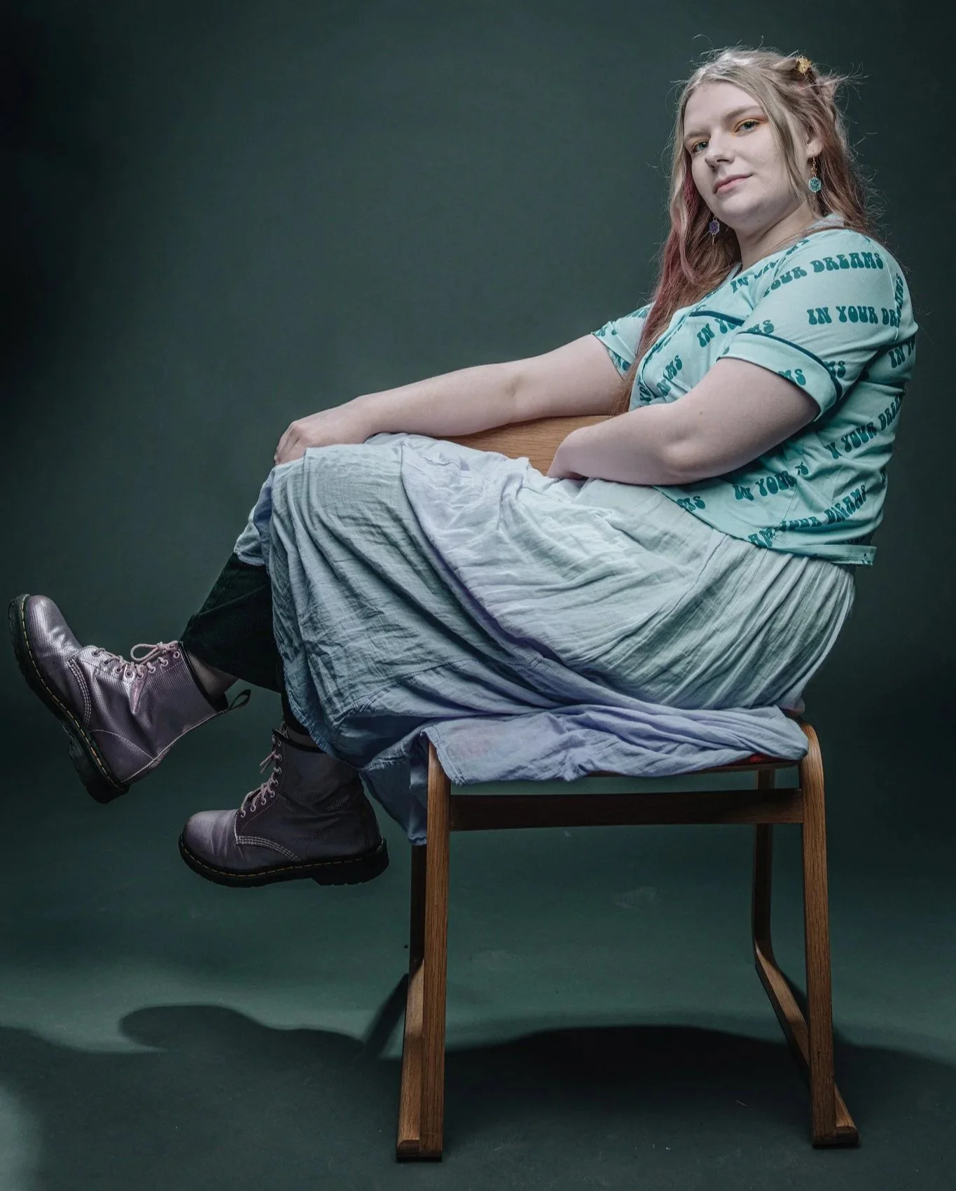 A white woman (Lily) sits on a chair sideways wearing a green t.shirt and green skirt with lilac metallic boots. She has long, wavy blonde hair, some sections dyed pink.