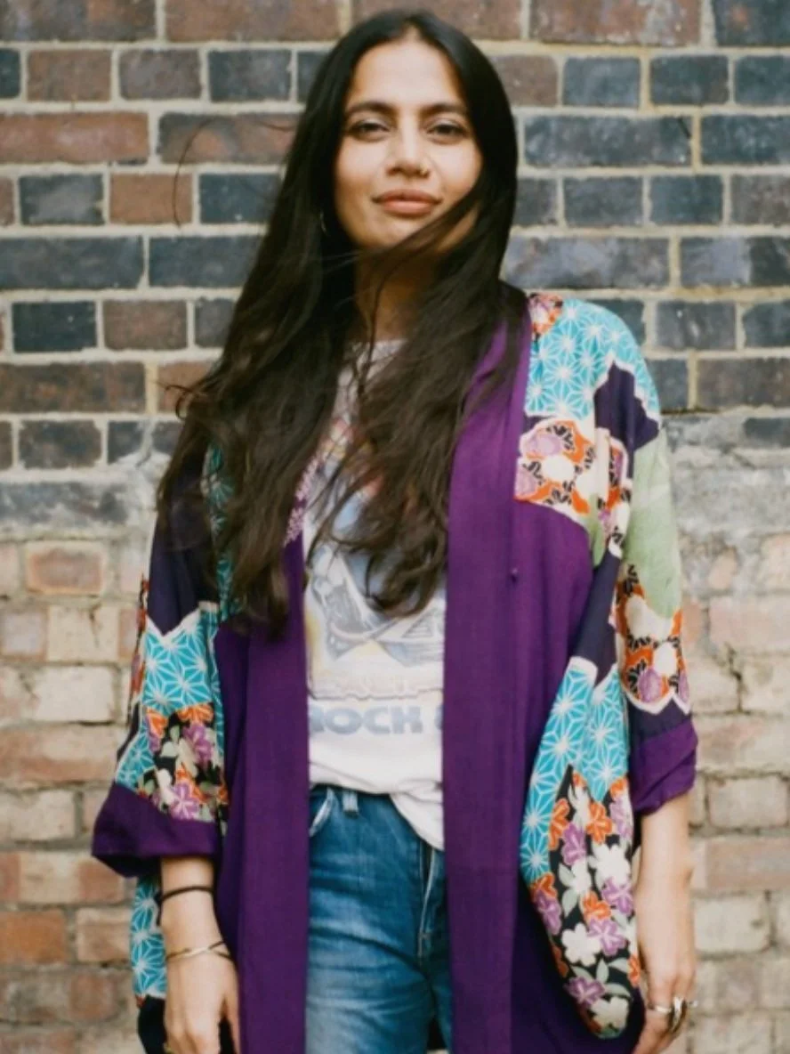 Priya is a British South Asian woman with brown skin and long dark brown hair. She is looking straight into the camera with her hair blowing in the wind, stood in front of a brick wall. She has a nose ring, brown eyes and wearing a colour kimono over her white tee and jeans.