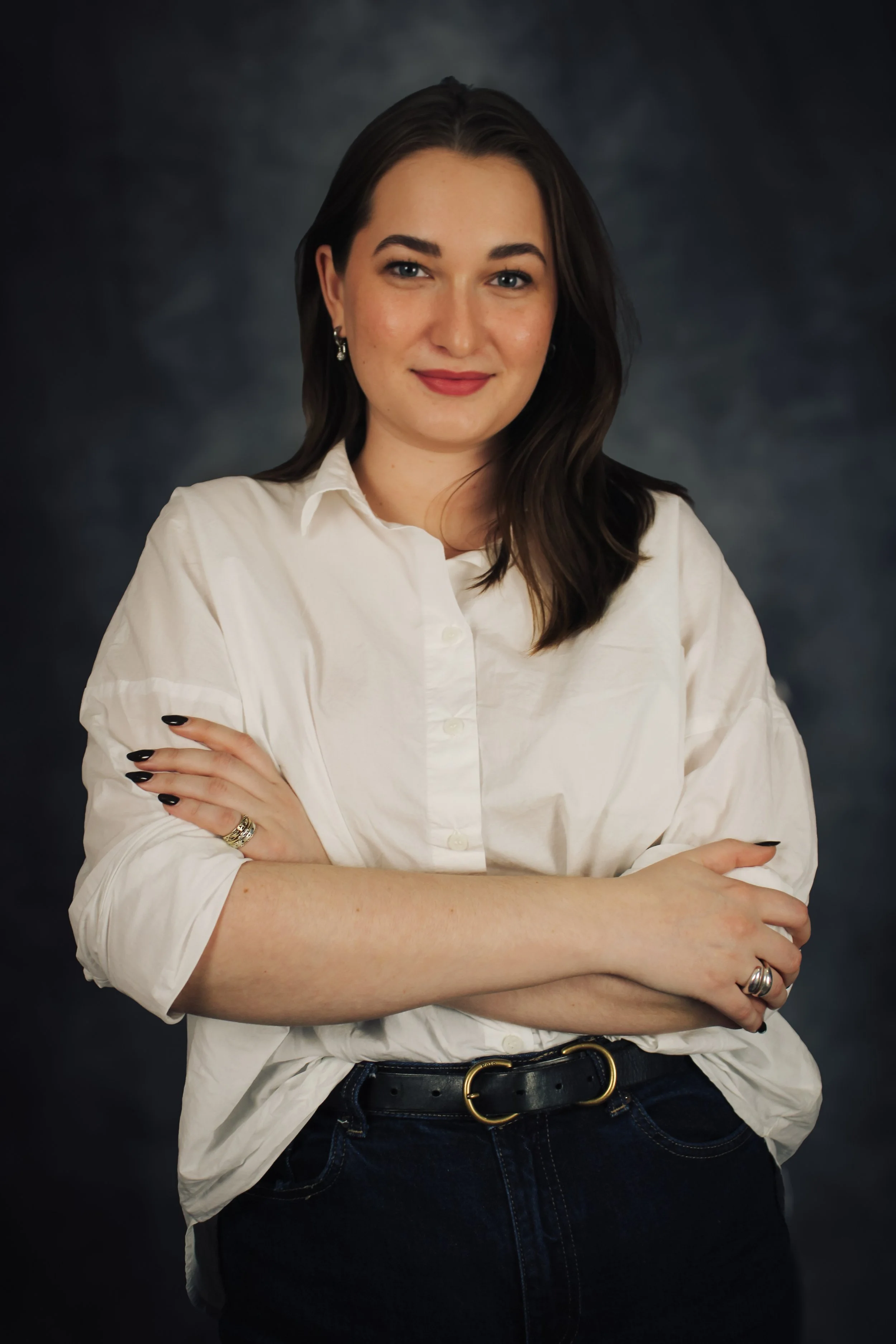 Rachael is a white woman in her late 20s with brown hair. In this headshot she is in a studio against blue/grey wall wearing a white shirt and jeans. She's smiling with her mouth closed and has dark painted nails and silver rings.