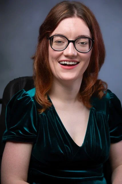 Storme is a white woman with long auburn hair. She wears glasses and a a black top as she sits in her power wheelchair.