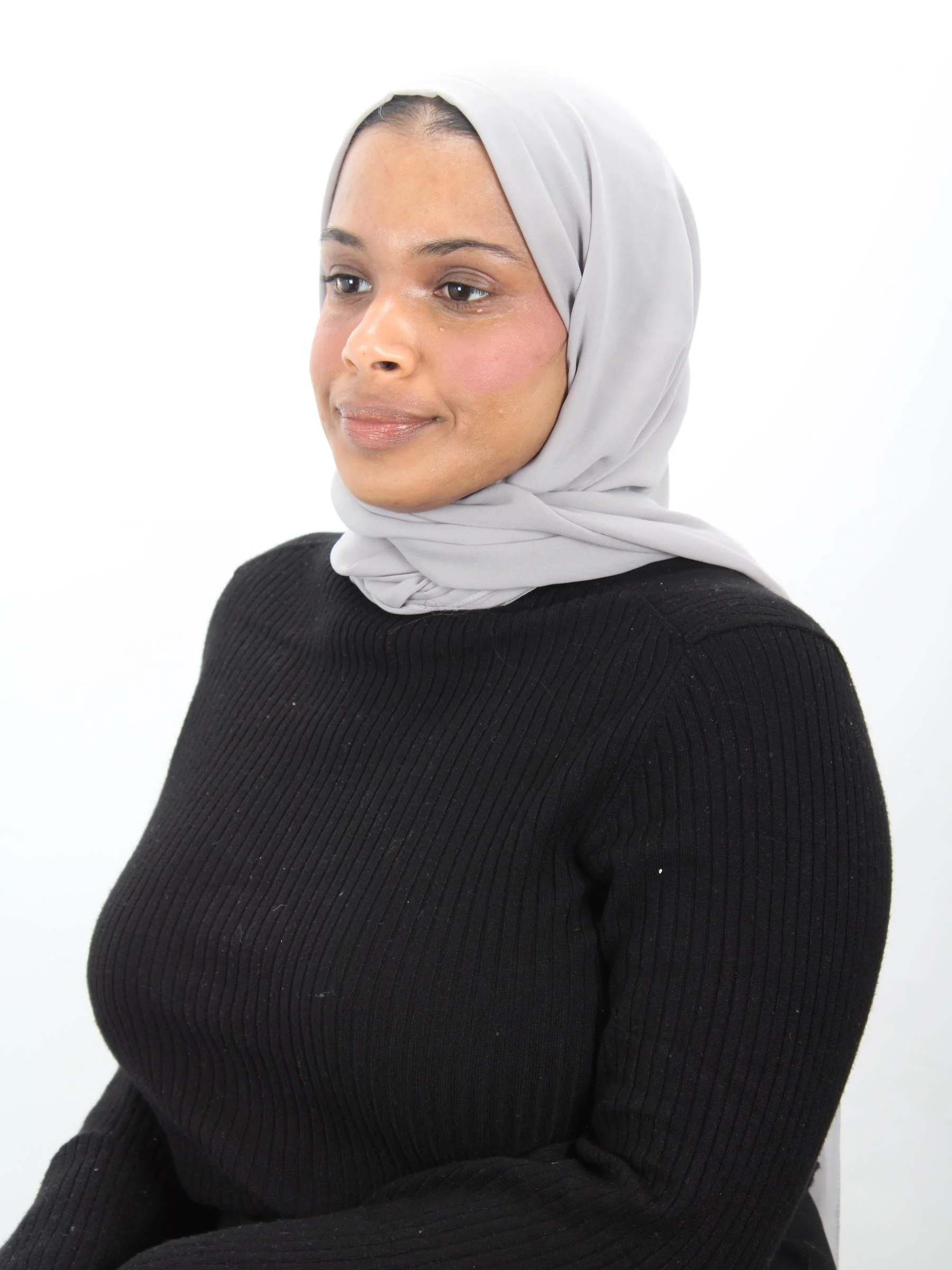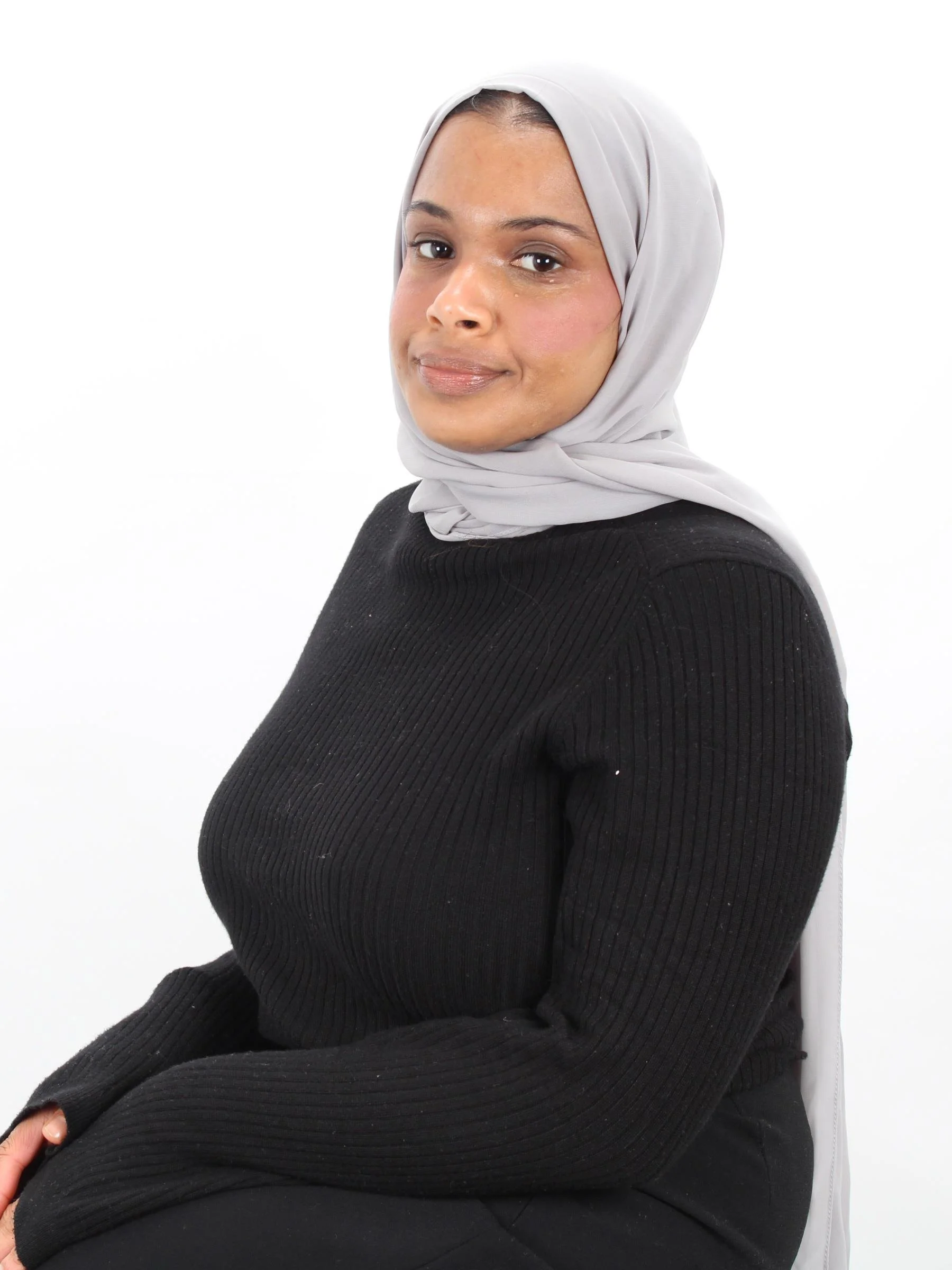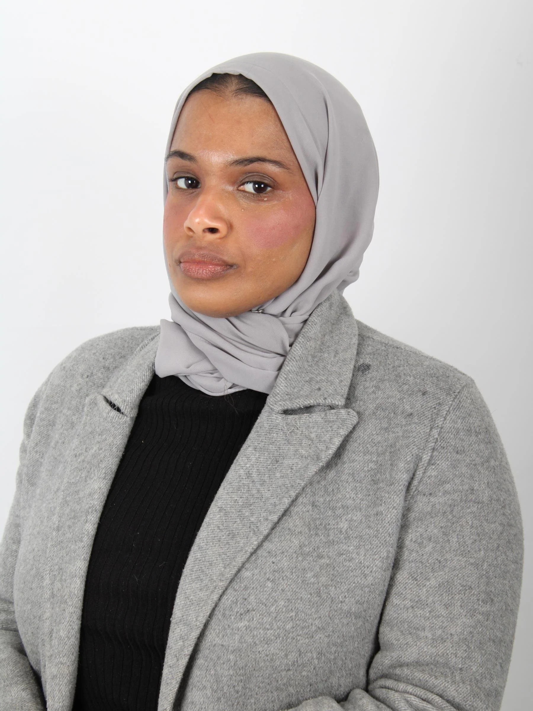 Umi is seated against a plain light grey background, facing the camera with a calm and confident expression. She is wearing a soft grey hijab neatly wrapped around her head, paired with a light grey coat over a black top.